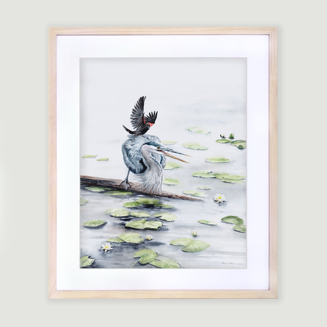 In this watercolor original, by artist Annie Moran, a red-winged blackbird catches a ride on the back of a blue heron as they float on a piece of driftwood. A moment is captured of playful interaction between two species atop a quiet pond, surrounded by lily pads.
