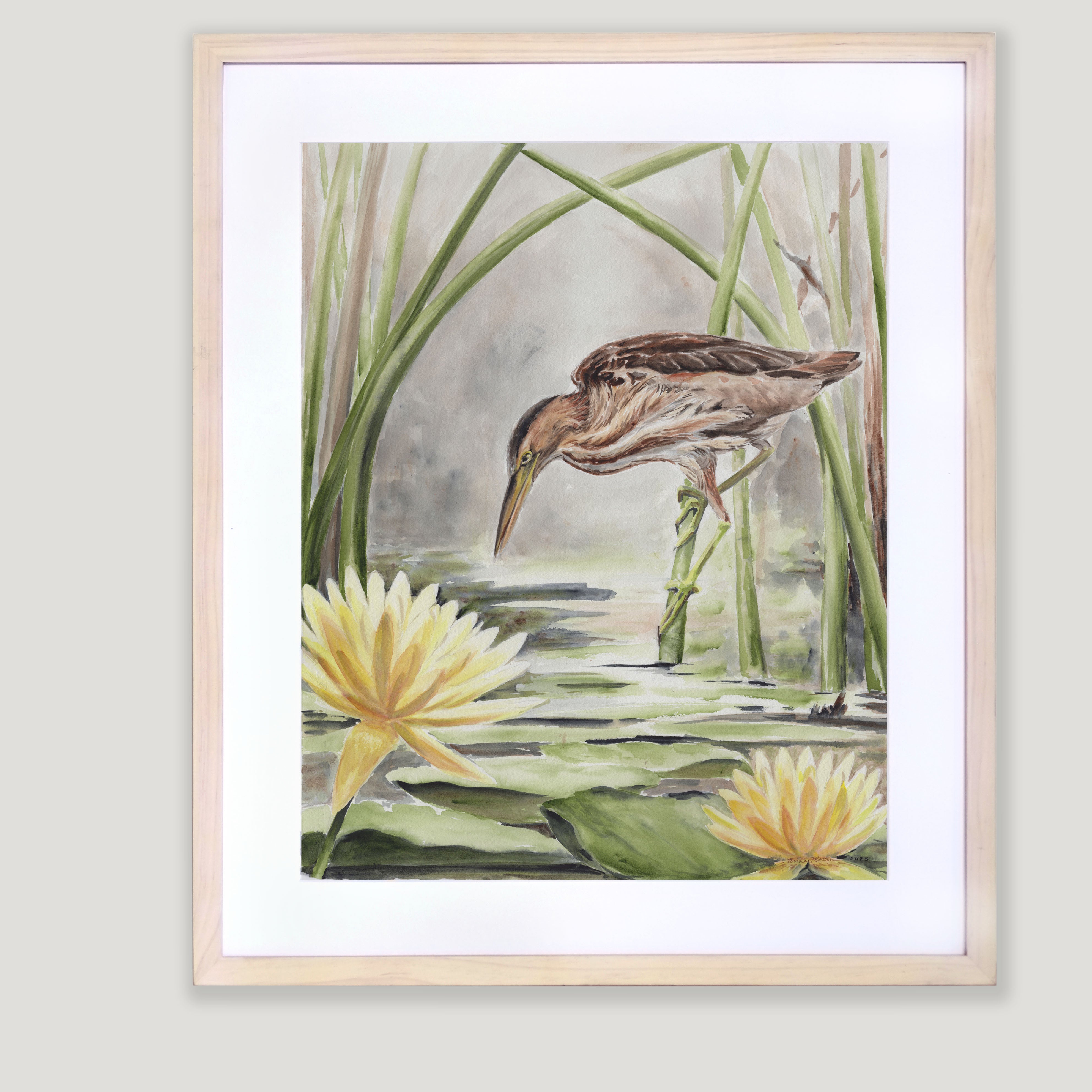 This curious least bittern peers into the murky depths between golden water lilies and lily pads in this large watercolor original, by artist Annie Moran.