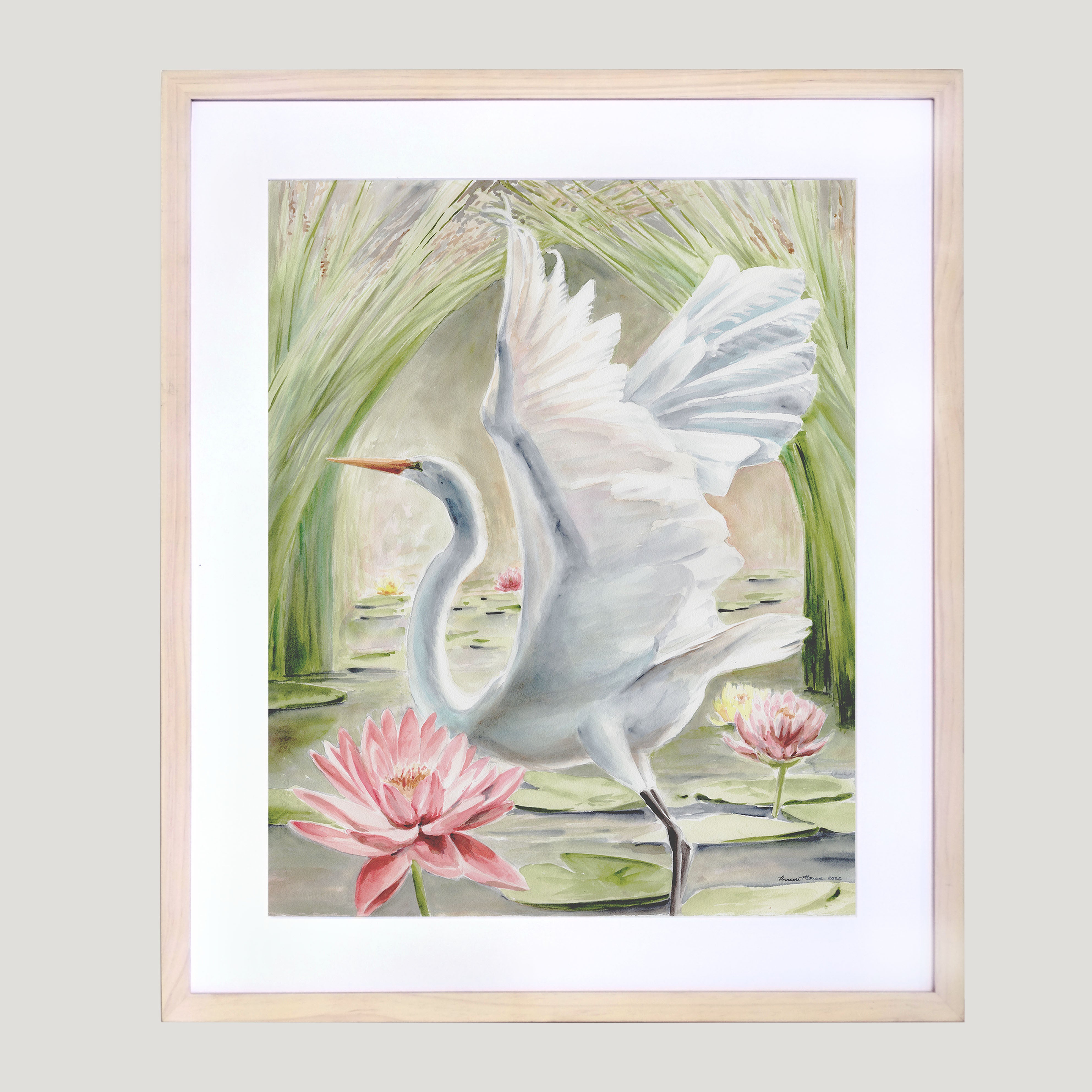 This original watercolor painting, by artist Annie Moran, depicts a large and graceful great egret taking flight among a calm setting of pink water lilies and reeds. The scene evokes the grace, power, and tranquility found in treasured natural places.
