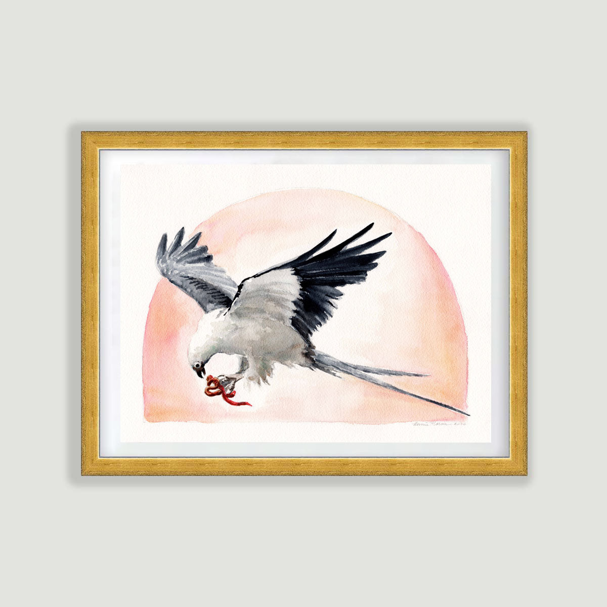 In this watercolor original, by artist Annie Moran, a swallow-tailed kite clutches a small coiled snake in mid flight against a soft peach background. The juxtaposition of imagery and color highlights both the beauty and intensity of nature. This painting pairs well with the watercolor Gift.